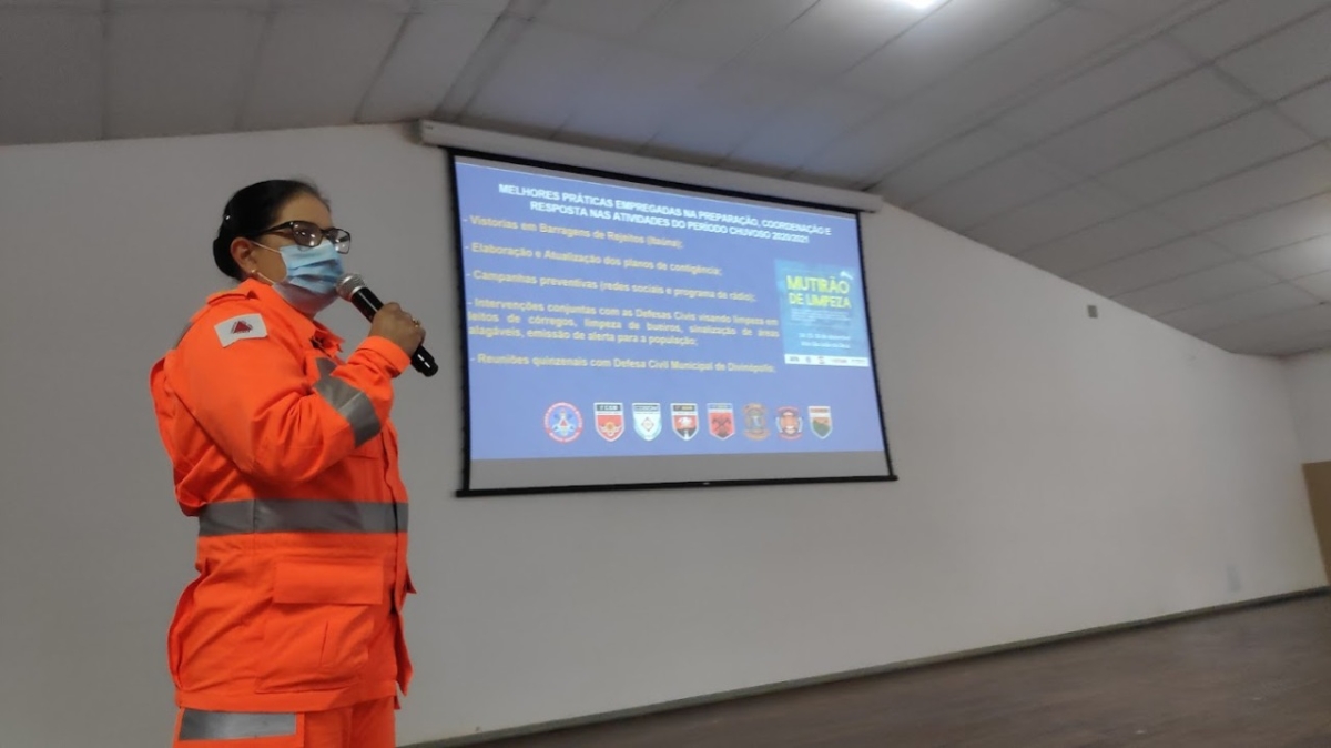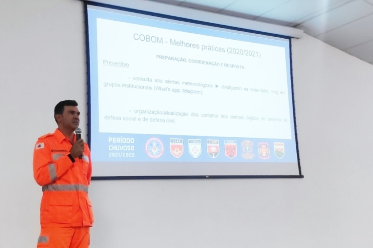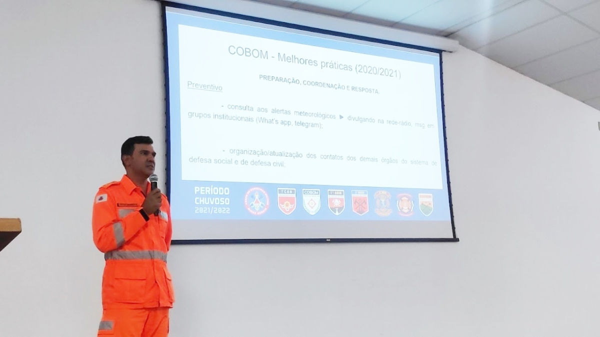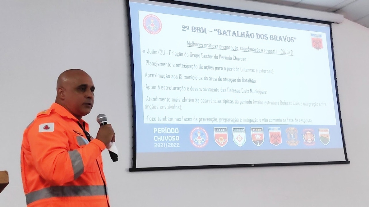 O coronel Sérgio José Ferreira Ferreira, comandante do Primeiro Comando Operacional de Bombeiros (1º COB), em sua apresentação, demonstrou o princípio da Segurança nas Ações Operacionais; o princípio do Comando e Controle; princípio da Gestão de Risco e a Divisão Operacional do 1ºCOB, discorreu sobre os principais tópicos do Plano Operacional do Período Chuvoso, com destaques para a elaboração de simulados, planos de contingência e incentivo à instalação do Sistema de Comando de Operações (SCO).