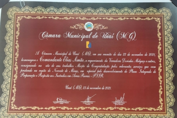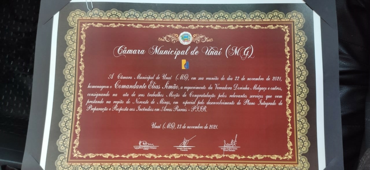 A Moção de Congratulação foi concedida pelos relevantes serviços que vem prestando na região do Noroeste Mineiro, em especial pelo Plano Integrado de Preparação e Resposta aos Incêndios em Áreas Rurais (PIIR), que atuou intensamente nos meses de agosto a outubro deste ano.