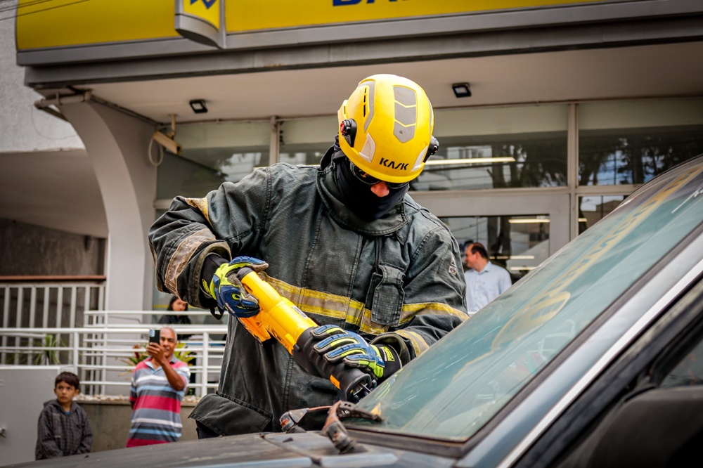 Durante a demonstração, os bombeiros realizaram a estabilização do veículo, fizeram a retirada simulada de uma vítima, utilizando técnicas de salvamento veicular e por fim, foi demonstrado o atendimento pré-hospitalar que é realizado na cena.