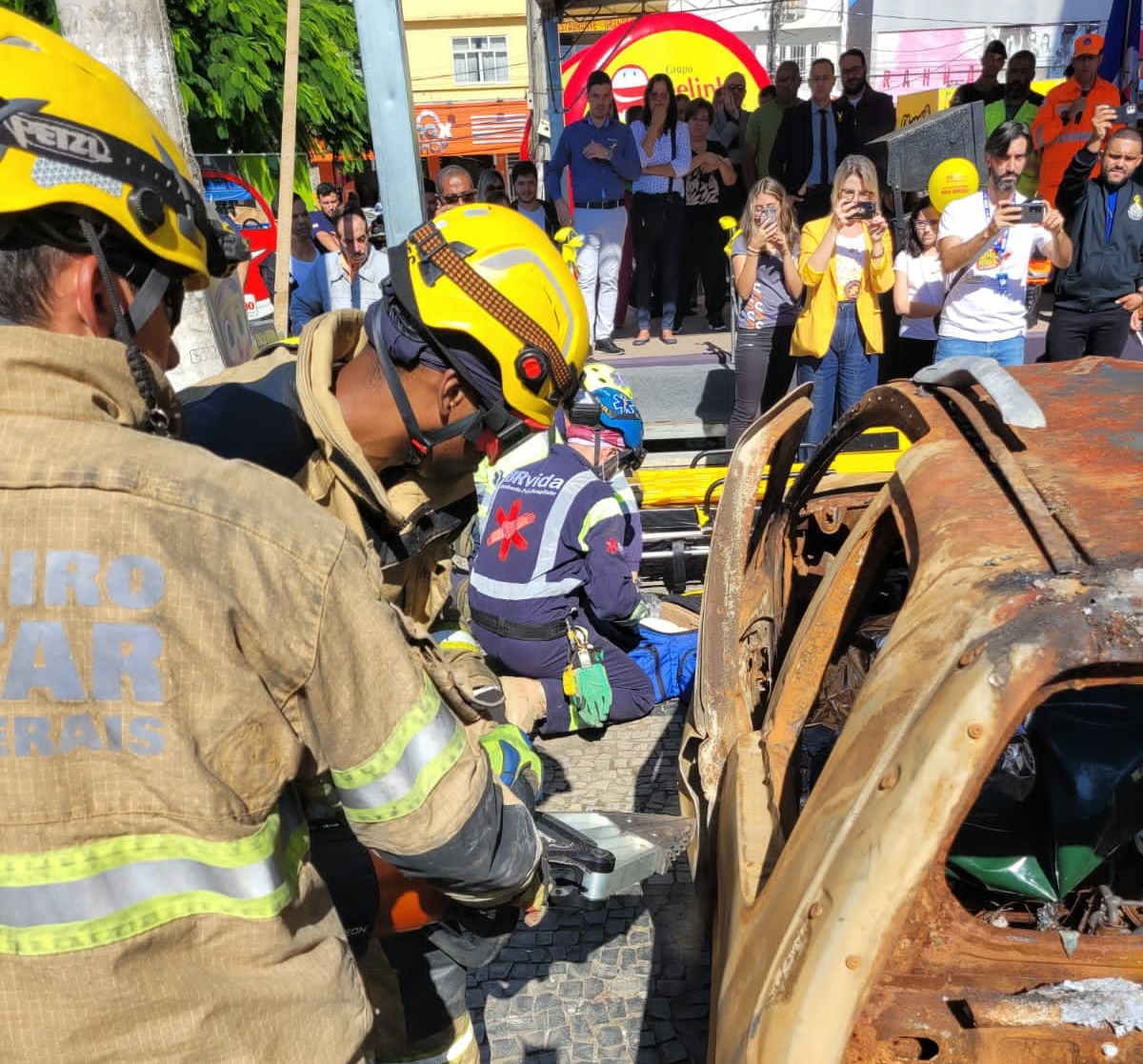 No simulado foi demonstrada a atuação do Corpo de Bombeiros Militar de Minas Gerais (CBMMG) diante de um acidente veicular com vítima encarcerada. A atividade foi realizada em conjunto com a concessionária Arteris que administra a rodovia BR-381.