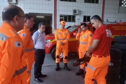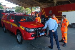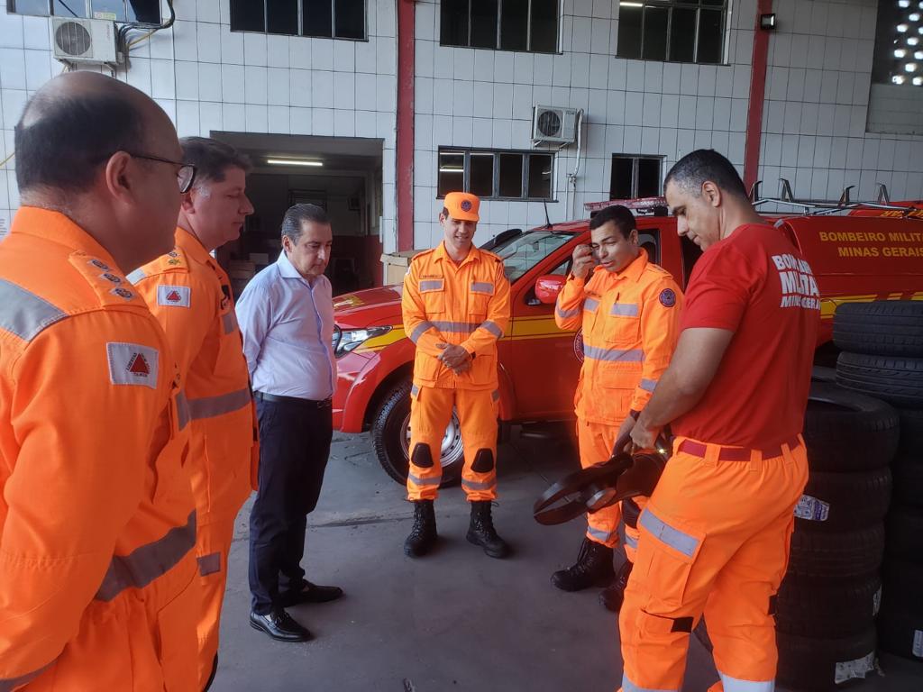 O comandante do CSM, major Montezano, juntamente com o chefe do Núcleo de Manutenção e Controle, major Abel, do chefe do Núcleo de Aquisição de Viatura e Equipamento, capitão Deiwes, e do comandante da 2ª Cia/11° BBM - Manhuaçu, tenente Flávio, recepcionaram o parlamentar e lhe apresentaram a viatura e os equipamentos adquiridos, destacando a importância destes para o serviço operacional do CBMMG.