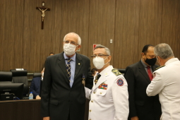 O coronel Edgard Estevo da Silva, comandante-geral do CBMMG e o coronel Erlon Dias do Nascimento Botelho, chefe do Estado-Maior comparecerem à solenidade, prestigiando os agraciados.