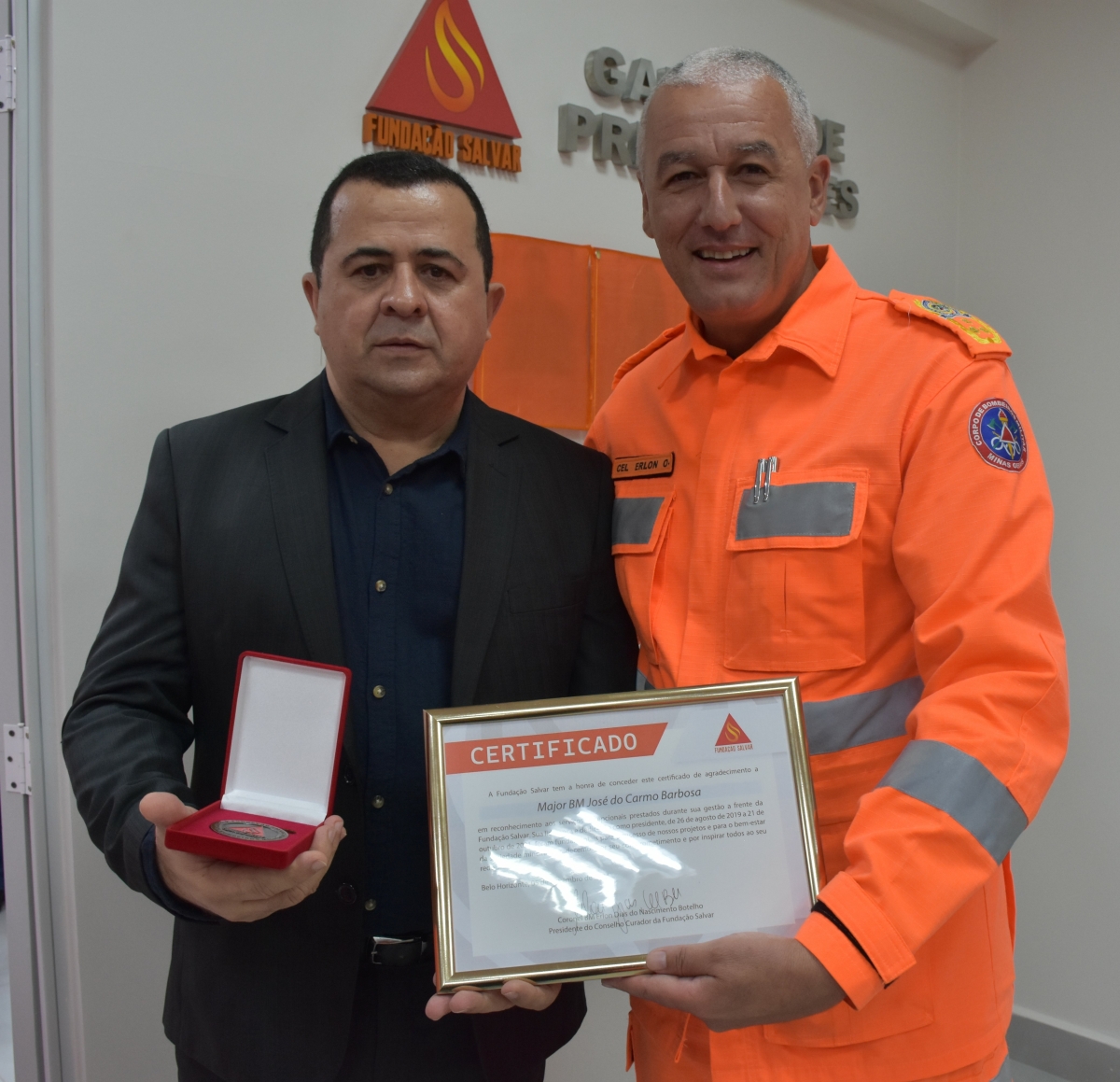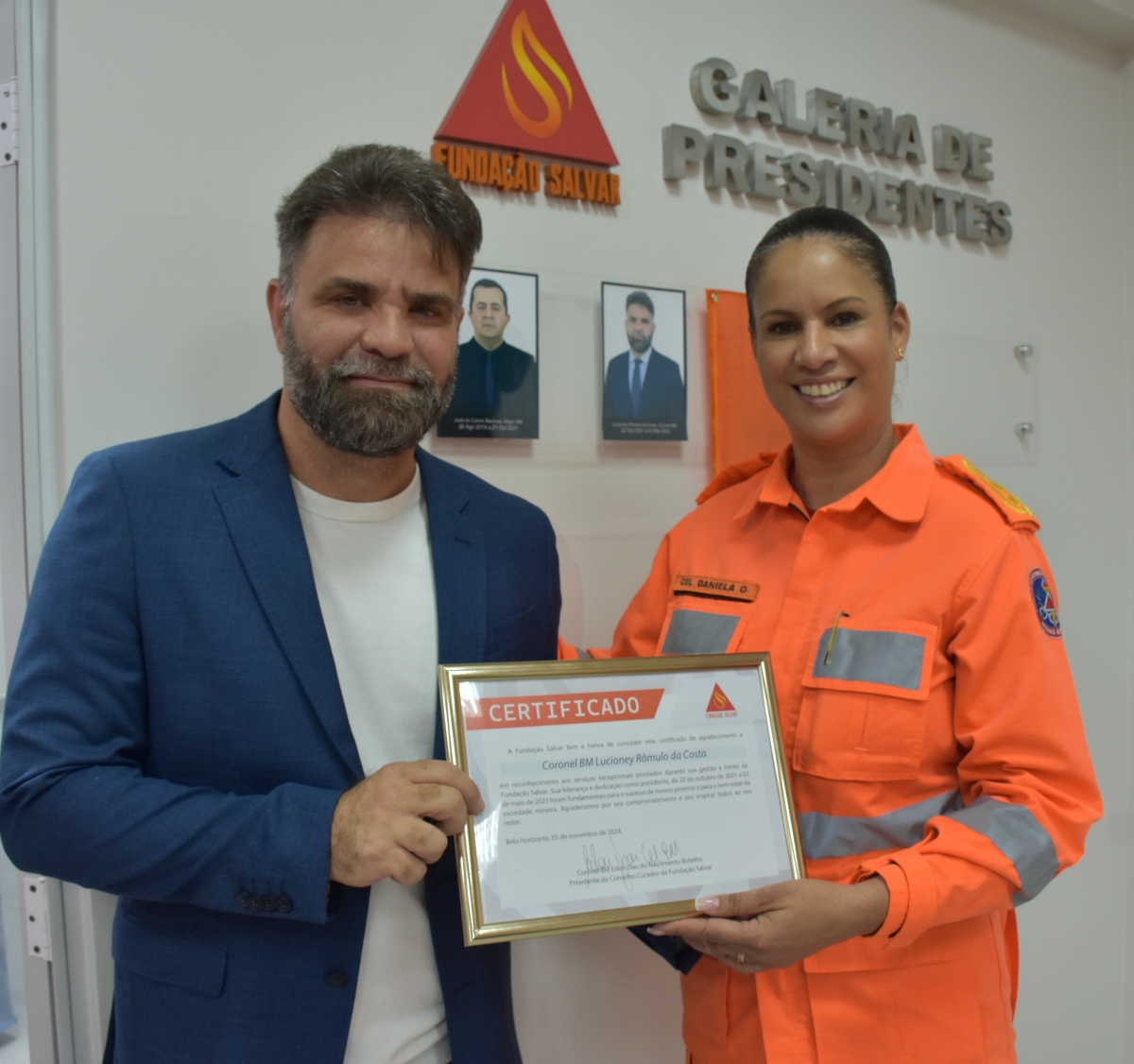 No dia 5 de novembro de 2024, a Fundação Salvar do Corpo de Bombeiros Militar de Minas Gerais (CBMMG) realizou a solenidade de passagem de presidência, na qual a major Adriana transferiu o cargo para o major Fellipe. A major Adriana, que atuou em diversos setores da Fundação desde sua criação em 2019, foi peça essencial na consolidação e crescimento expressivo da instituição. Agora, o major Fellipe, trazendo sua vasta experiência em gestão financeira e orçamentária, assume o compromisso de continuar o legado de sua antecessora, almejando fortalecer ainda mais a captação e a gestão de recursos, além de ampliar o impacto das ações sociais da Fundação em benefício não só do Corpo de Bombeiros, mas de toda a sociedade.